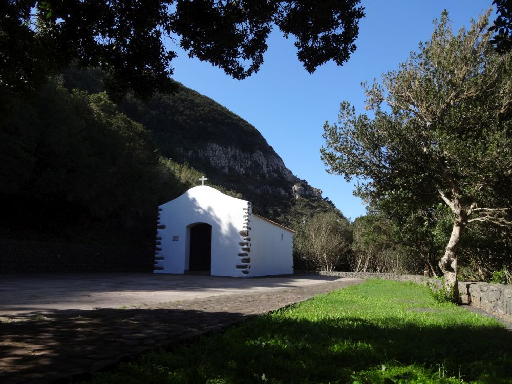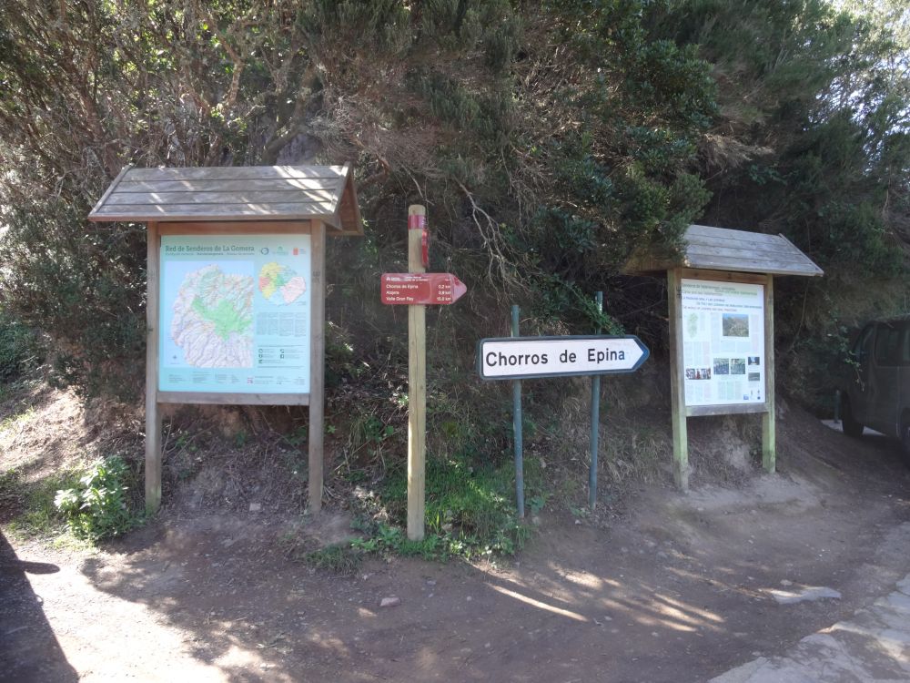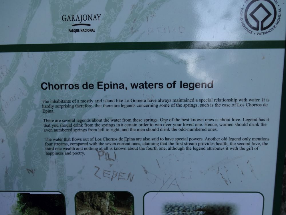 Ein wahres Touristenhighlight ist die Quelle Chorros de Epina. Für Gomera-Verhältnisse war es dort richtig überlaufen. Es gibt alles, was es für eine richtige Sehenswürdigkeit braucht: Parkplatz, Café, massenweise Hinweisschilder und Erklärungen, schöne Legenden und Geschichten, eine Kapelle und einen Fußweg, der Barrierefreiheit verspricht, aber nicht einhält. Wir mussten das also auch anschauen.