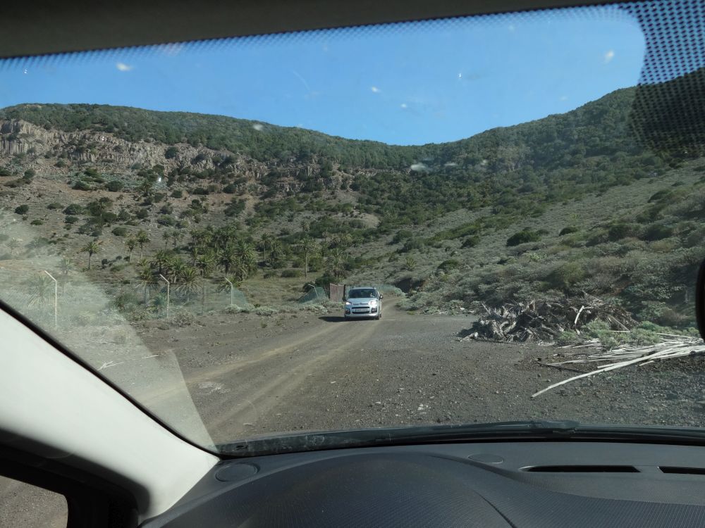 Wir sind jedenfalls ganz froh, dass es nicht feucht ist, sonst würde unser Renault Clio ohne Allrad und Bodenfreiheit ziemlich schnell aufgeben. So wagen wir uns auf die Piste. Steinschlag wird hier ganz neu interpretiert. Während schon auf den normalen Straßen (alphaltiert und mit einer Spur in jeder Richtung) zuweilen Steine rumliegen, ist das hier eher die Regel als die Ausnahme.